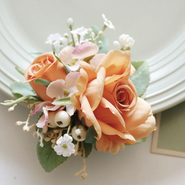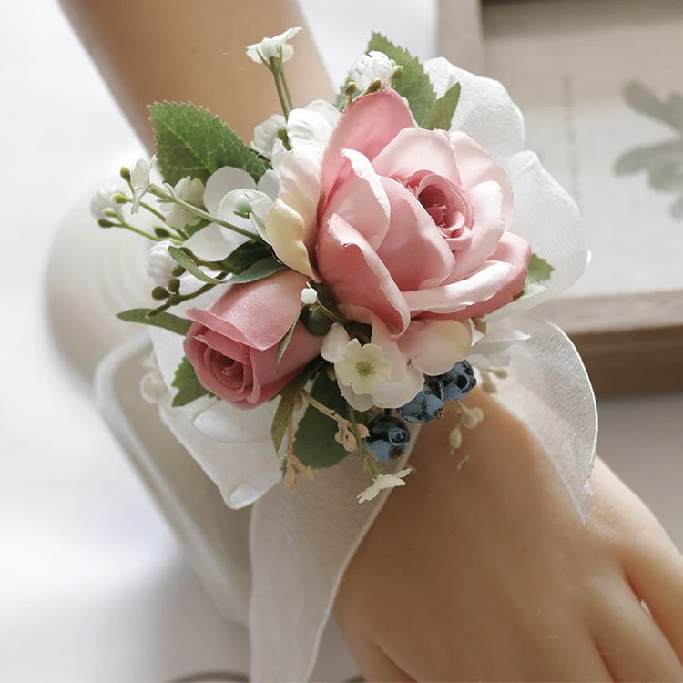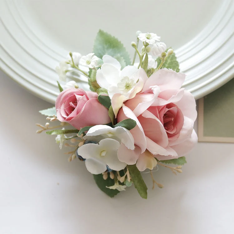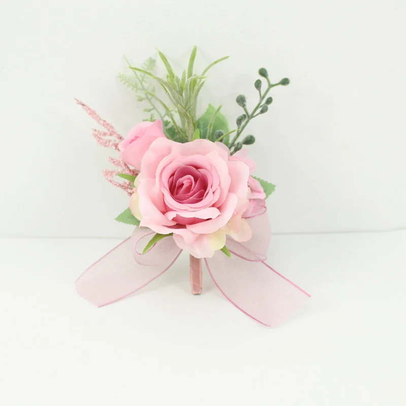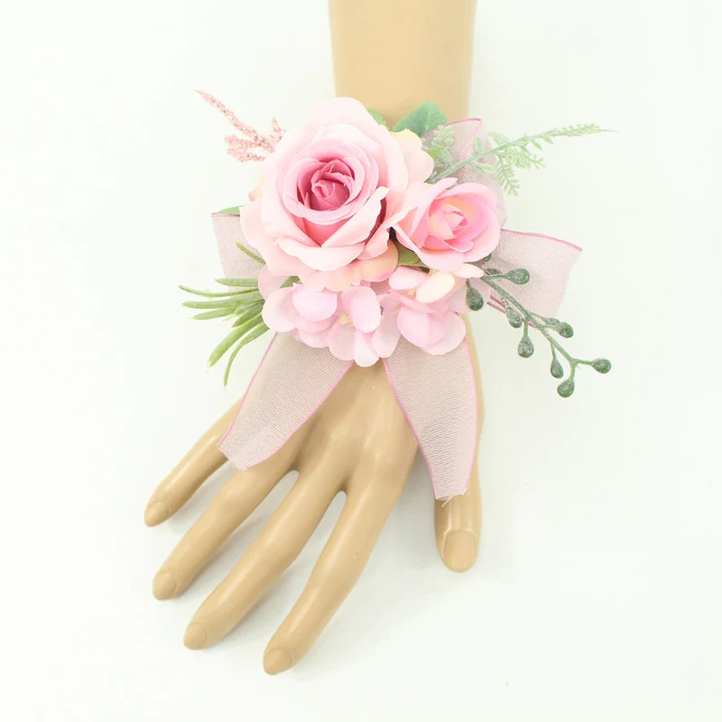4 pezzi polso fiore corpetto damigella d’onore fiore fatto a mano seta artificiale rosa braccialetto fiori per la festa nuziale