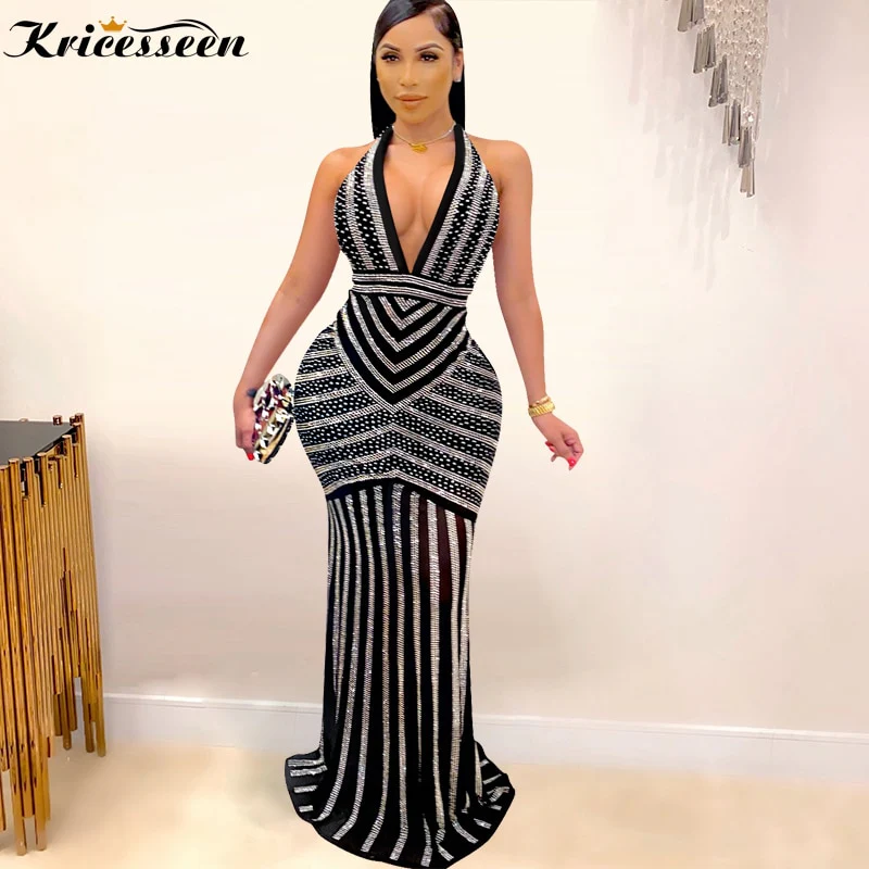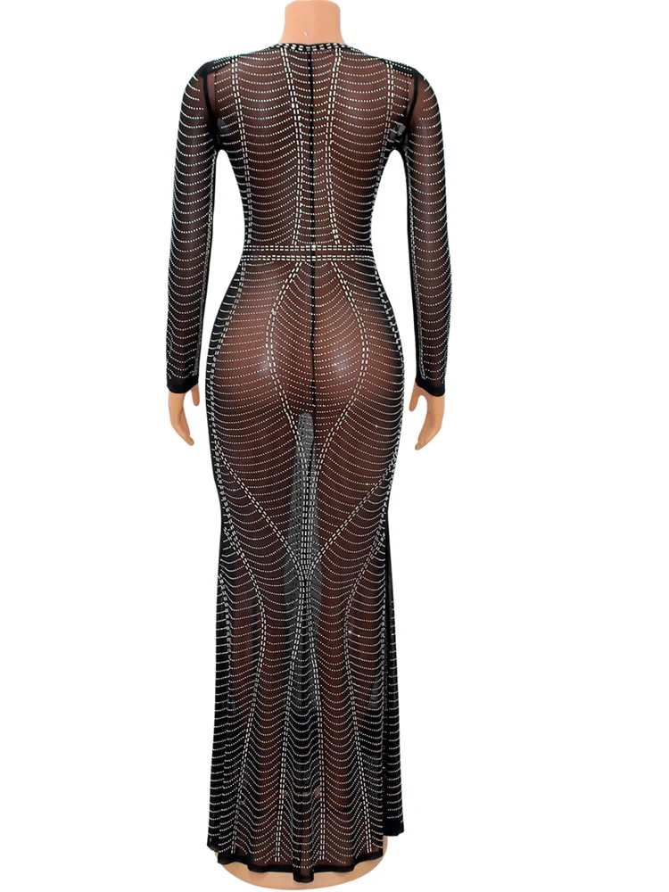 Abiti aderenti trasparenti in maglia di cristallo nero sexy per abiti da donna con scollo a V a maniche lunghe Abiti da discoteca Abiti per occasioni speciali